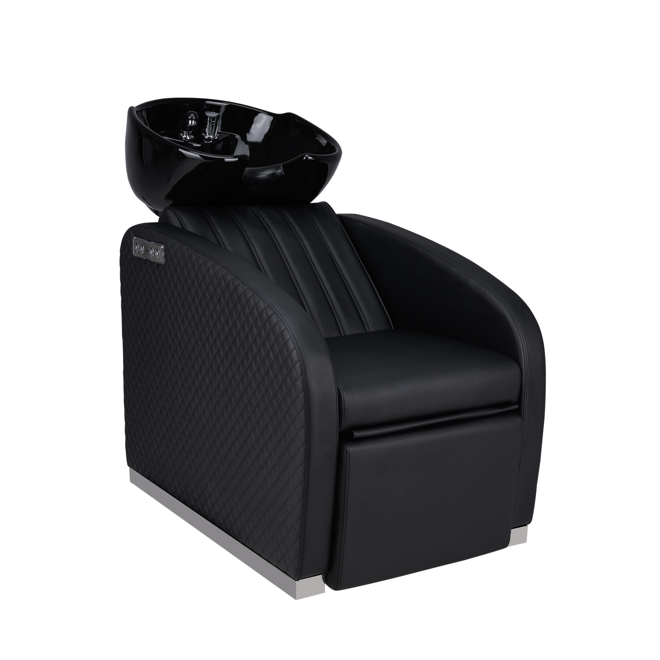 Det polstrede setet med vertikale sømmer gir et eksklusivt og raffinert uttrykk, mens elektrisk benstøtte og innebygd shiatsu-massasje sørger for maksimal komfort. De diamantformede sømmene på armlenene tilfører et luksuriøst preg, og den store keramiske vasken gjør arbeidet både effektivt og behagelig for frisøren.